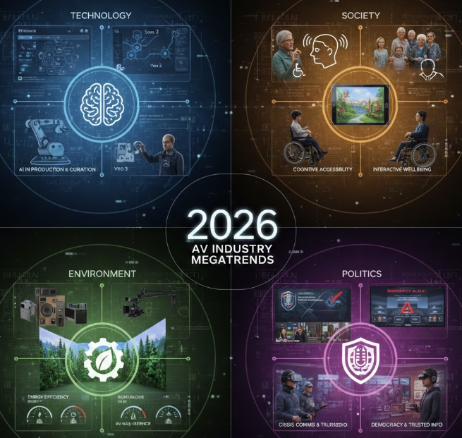 Tässä on kooste AV-alan megatrendeistä vuodelle 2026, sovellettuna AV-alan tuoreimpiin linjauksiin: