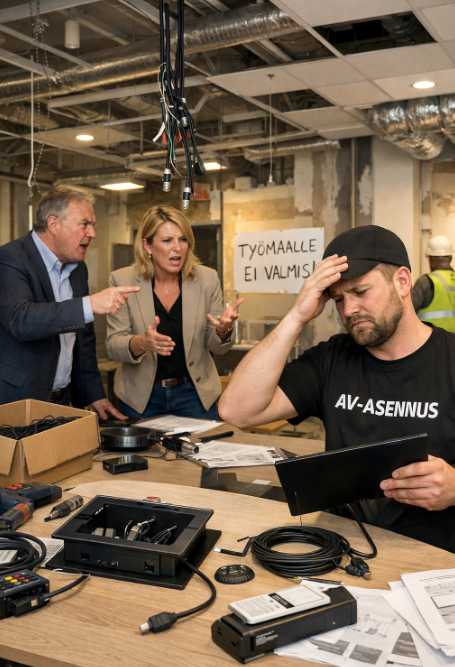Rakennusprojektien maailma on täynnä liikkuvia osia, riippuvuuksia ja väistämättömiä yllätyksiä. Silti yksi asia tuntuu toistuvan projektista toiseen: kun aikataulu alkaa venyä, katseet kääntyvät nopeasti niihin toimijoihin, jotka ovat näkyvimpiä loppuvaiheessa. Usein se tarkoittaa AV-toimittajia. Tilanne on tuttu. Rakennusurakka on jo viikkoja, jopa kuukausia myöhässä. Sähkötyöt ovat kesken, tilat eivät ole valmiita, muutostyöt jyllää, eikä järjestelmiä päästä asentamaan suunnitellussa järjestyksessä. Silti projektipalaverissa joku kysyy: “Miksi AV-kokonaisuus ei ole vielä valmis?”